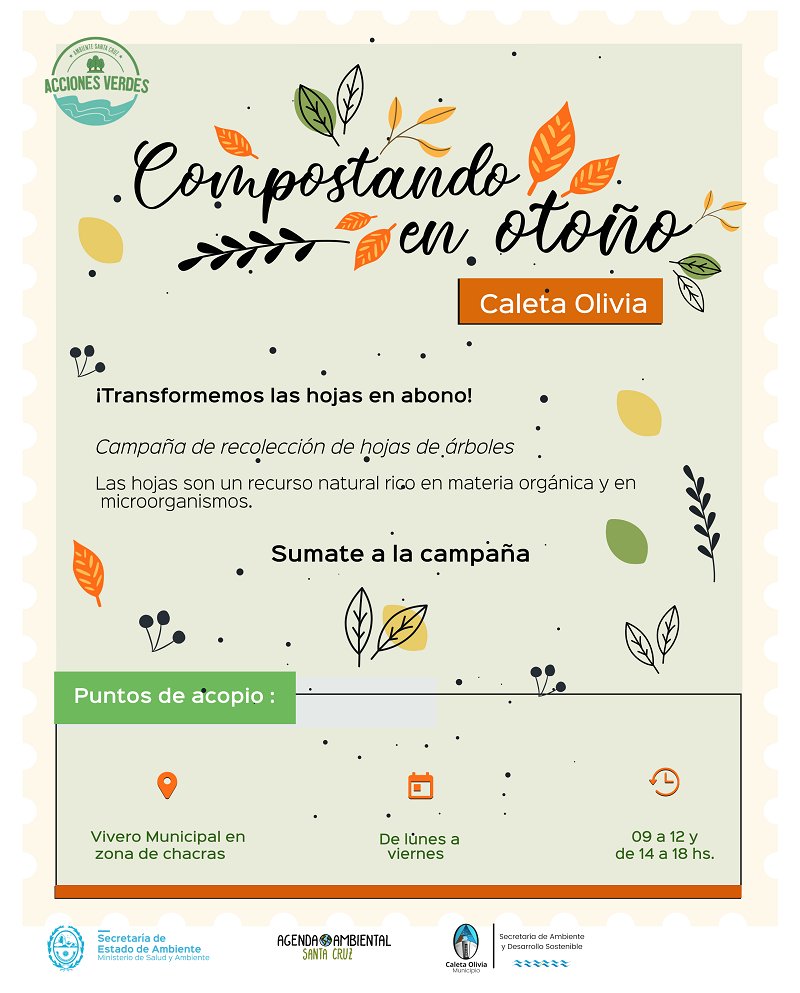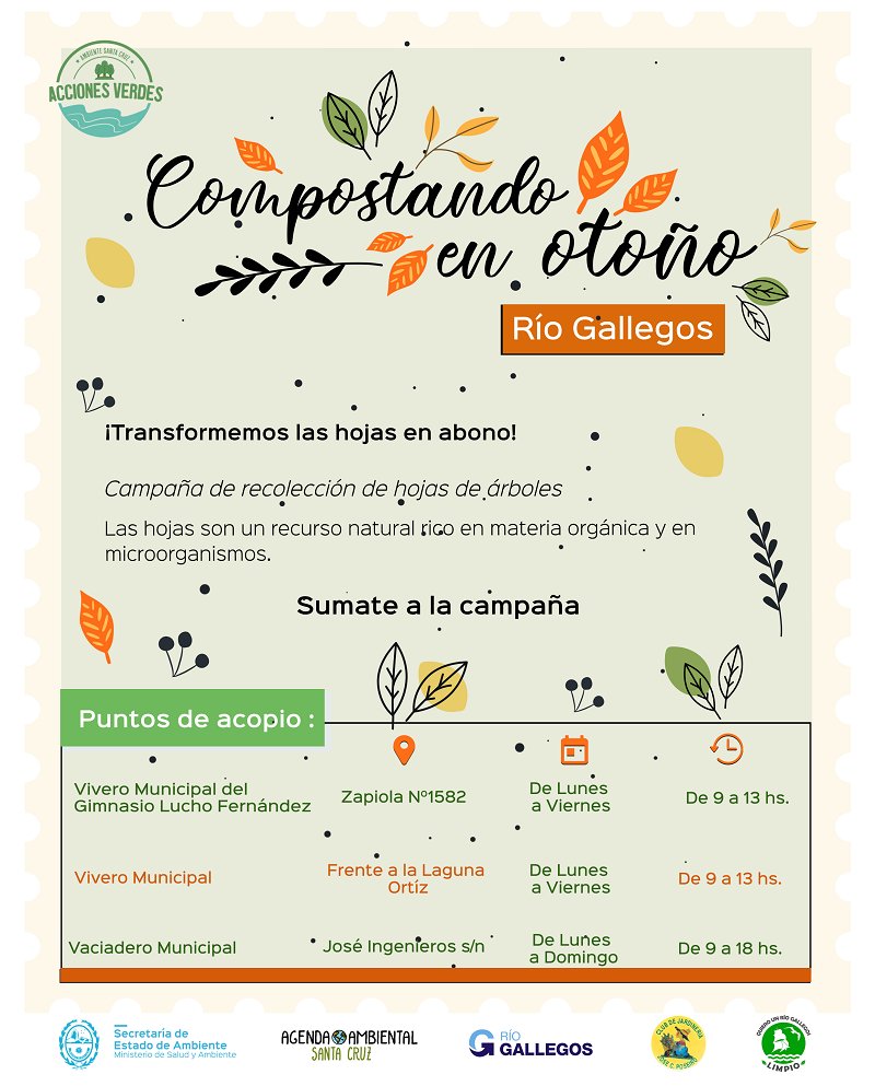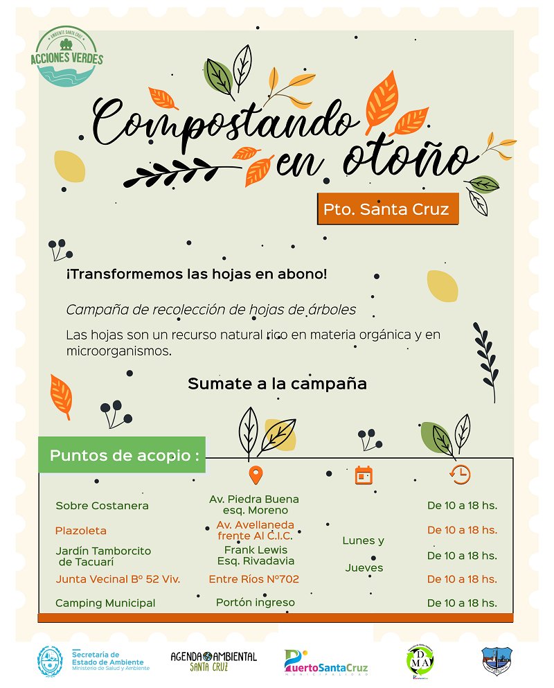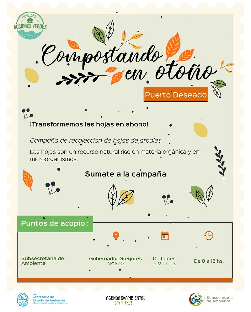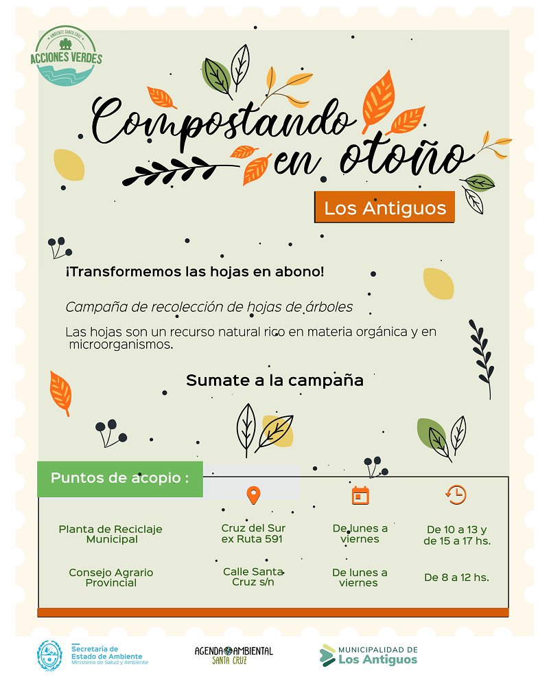 En el marco del “Día de la Tierra”, el Gobierno de Santa Cruz, a través de la Secretaría de Ambiente, junto a la Asociación Civil Agenda Ambiental, Gobiernos Municipales, Comisiones de Fomento y Organizaciones Sociales de la provincia, inician la campaña “Compostando en Otoño 2021”, mediante la cual recolectarán hojas de árboles en distintos puntos locales.