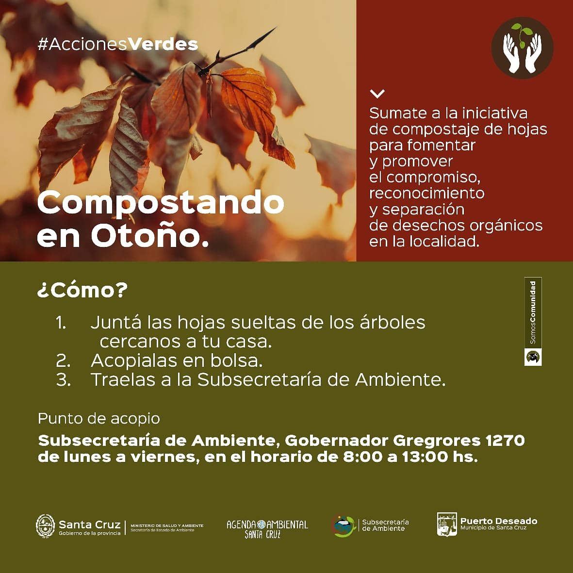 "Compostando en Otoño" se enmarca en el Programa "Acciones Verdes", impulsado por el Gobierno de Santa Cruz y en articulación con municipios locales y organizaciones sociales que abordan la temática ambiental.