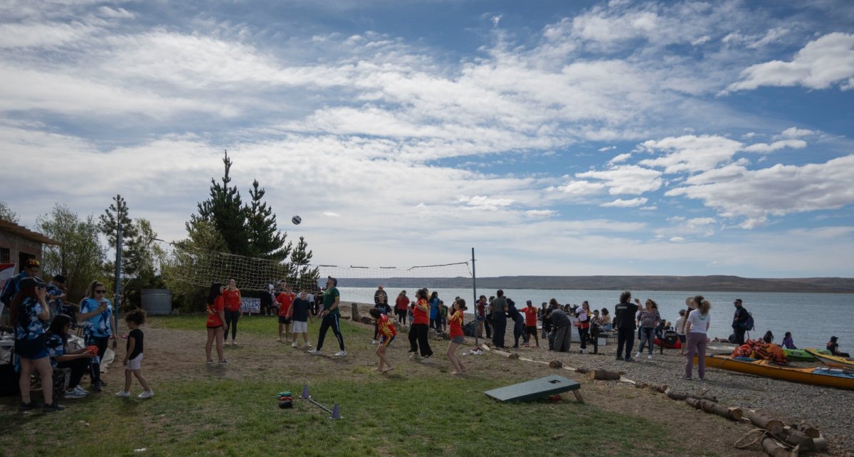 Durante toda la tarde, el estuario se llenó de movimiento. Las actividades deportivas y recreativas, organizadas por las áreas de Deporte y Juventudes del Ministerio de Desarrollo Social, incluyeron partidos de vóley que se mantuvieron activos de manera continua, juegos de Cornhole y la presencia de la mascota de Deporte, generando espacios de encuentro y participación para todas las edades. Uno de los mayores atractivos fue el paseo y la práctica de kayak en el Río Gallegos, coordinado por la Asociación de Kayak I Yenu Jono, donde se observó una gran fila de personas aguardando su turno, reflejo del entusiasmo que despertó la propuesta.