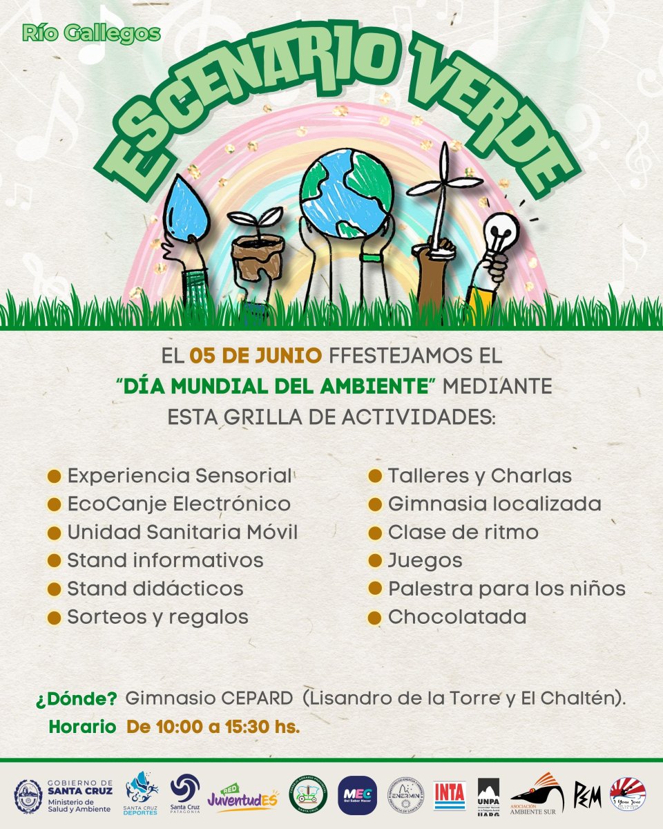 El Gobierno de Santa Cruz, a través de la Secretaría de Ambiente junto a la Secretaría de Deporte, Secretaría de Turismo, Subsecretaría de Juventudes, Mercado de Economía Comunitario, CAP, ENERMIN, INTA, UNPA, Atención Primaria de la Salud, CPE, asociaciones Ambiente Sur y Por el Mar, Vivero Los Fresnos, Fundación Garrahan, Asociación I Yenú Jono y participantes, celebran una jornada participativa y educativa bajo el lema “Escenario Verde”.