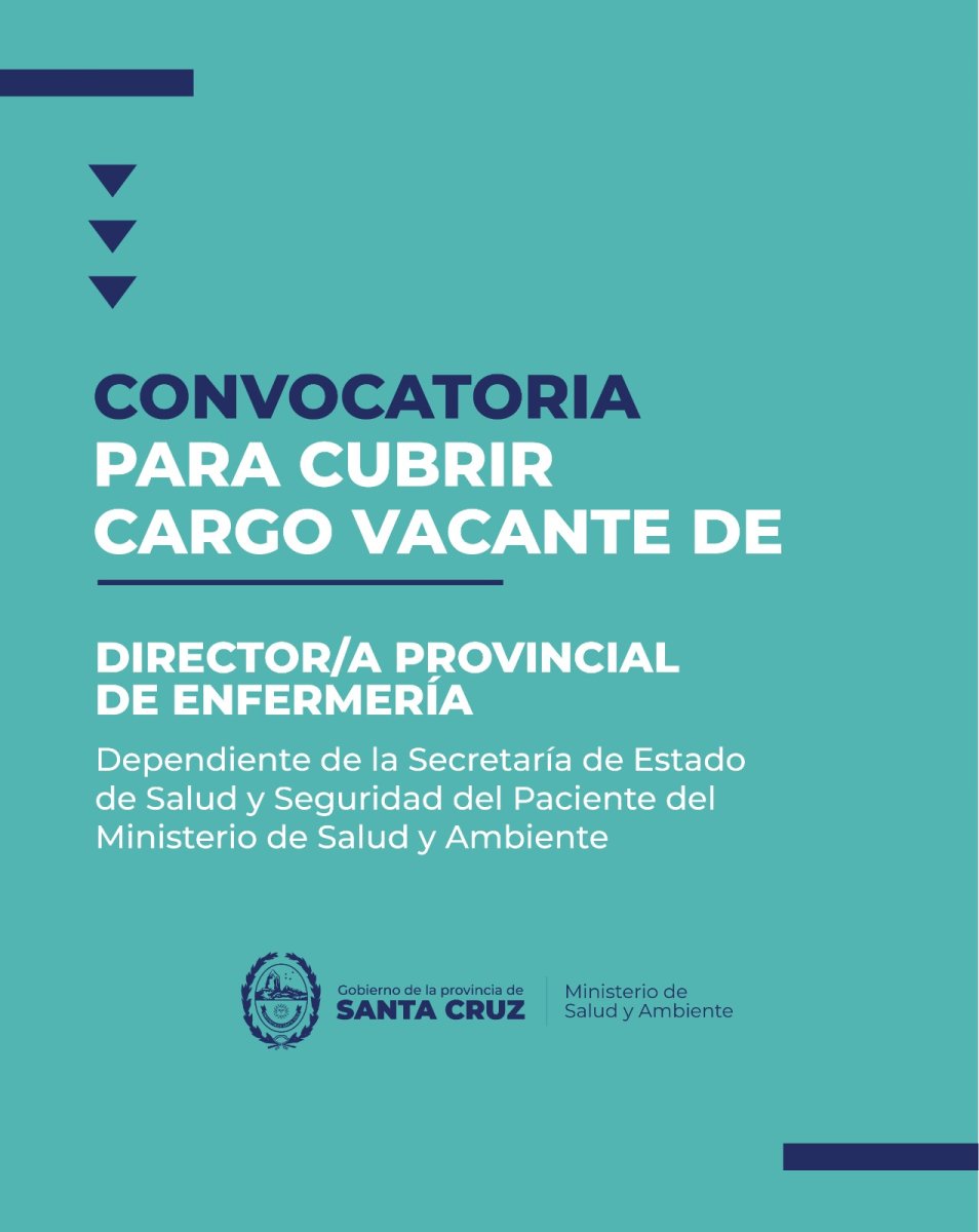 El Gobierno de Santa Cruz, a través del Ministerio de Salud y Ambiente, informa que a partir del martes 16 de abril, se abre la convocatoria para cubrir el cargo de Director/a Provincial de Enfermería dependiente de la Secretaría de Estado de Salud y Seguridad del Paciente.