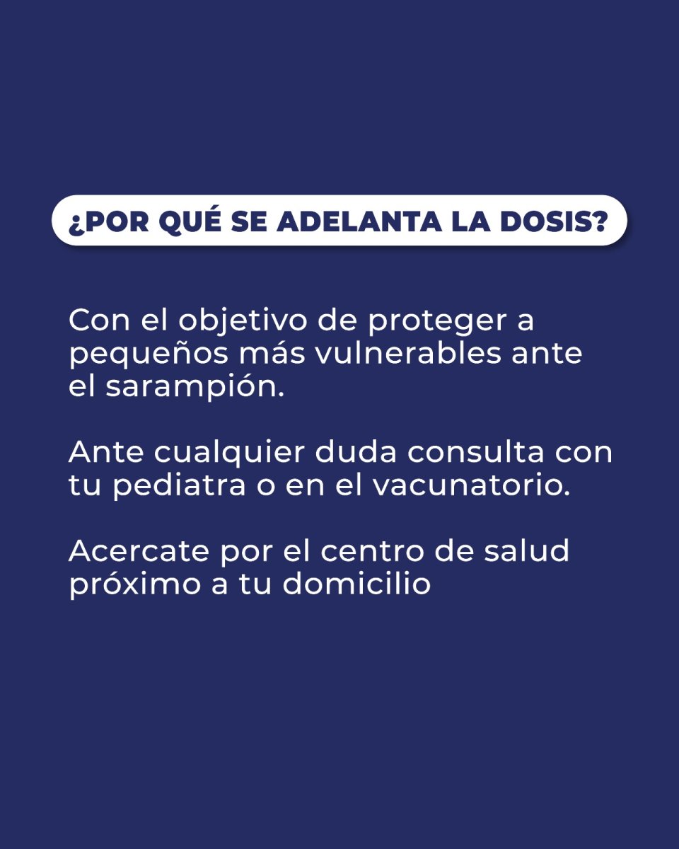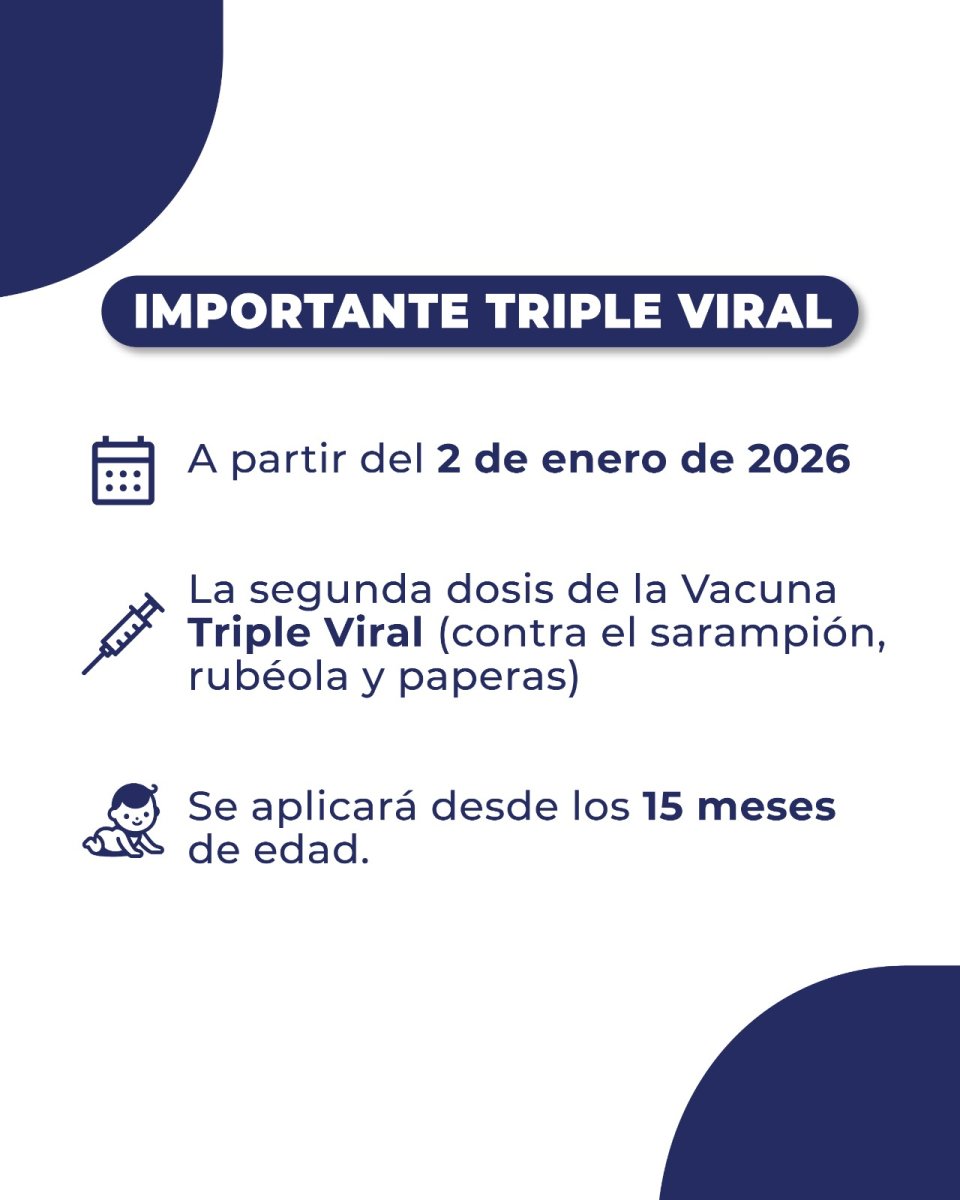 Con el objetivo de disminuir el tiempo en que los niños permanecen susceptibles a contraer sarampión, rubéola y parotiditis —especialmente en edades en las que estas enfermedades pueden presentar complicaciones graves o incluso letales—, a partir del 1° de enero de 2026 la segunda dosis de la vacuna triple viral se aplicará entre los 15 y 18 meses de edad.