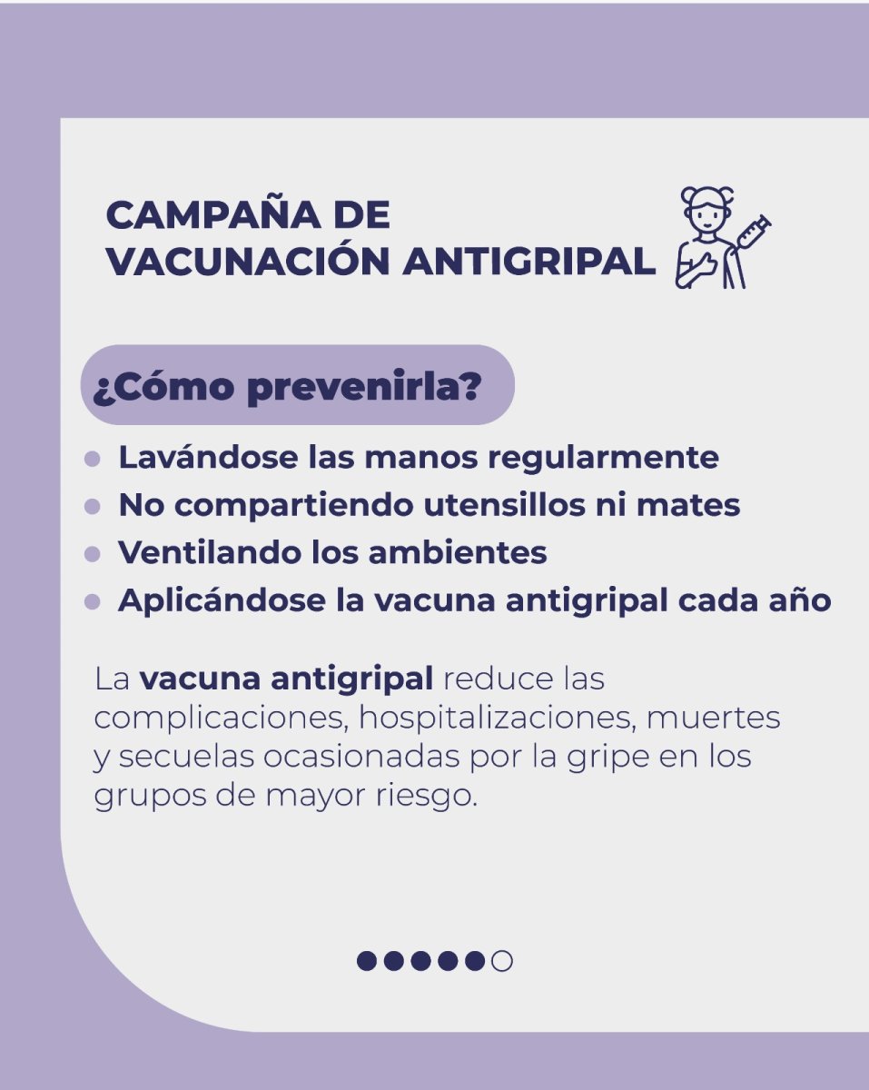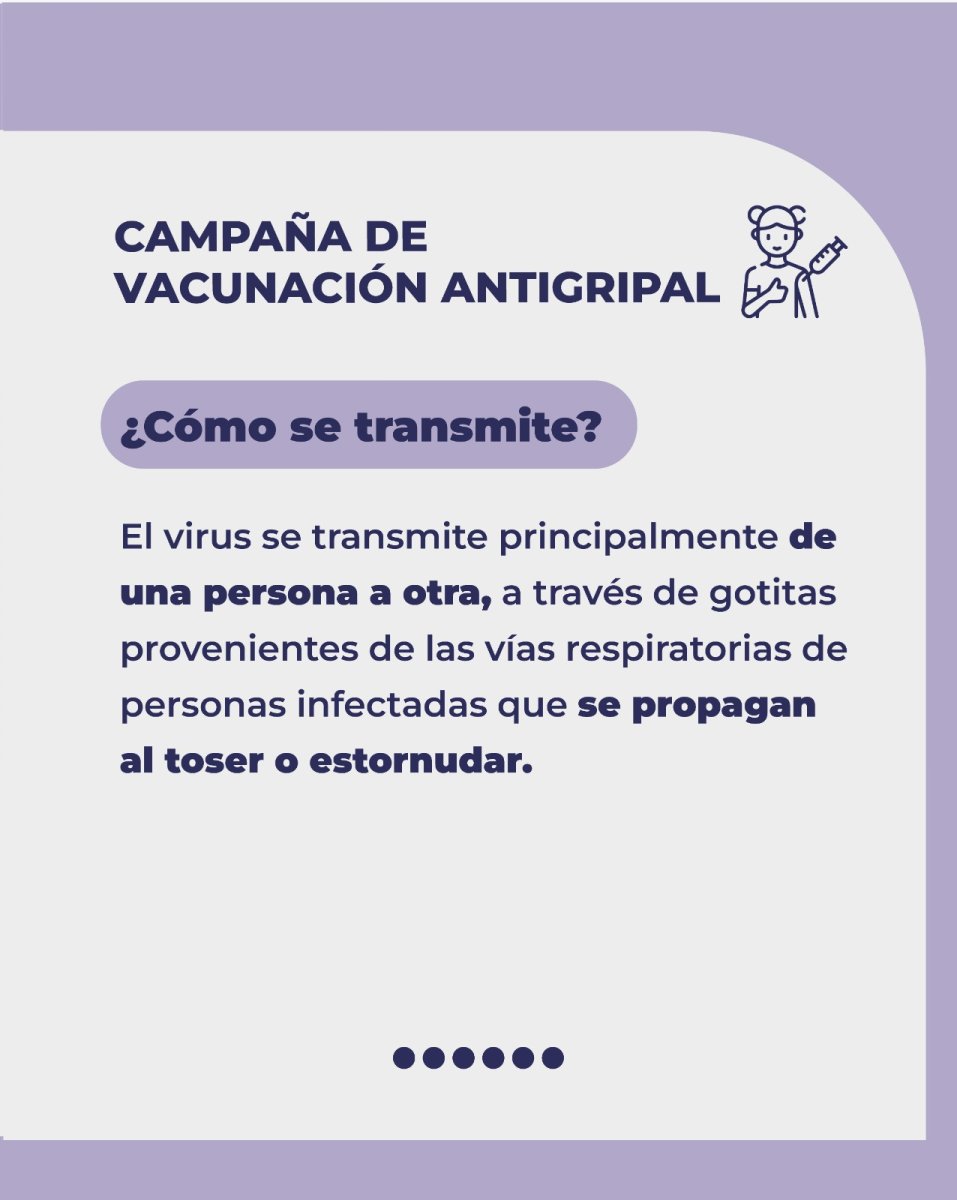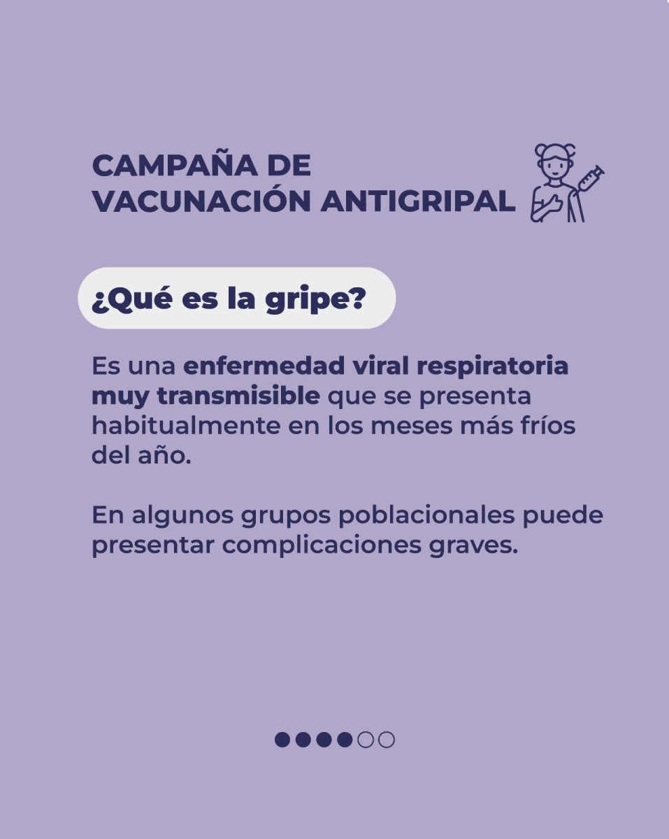 La gripe o influenza es una enfermedad viral respiratoria muy transmisible. Por lo general, la mayoría de los afectados se recupera en una o dos semanas. Sin embargo, puede ocasionar graves complicaciones, incluso la muerte, a personas de 65 años y más, niños/as pequeños/as, personas gestantes y aquellas con factores de riesgo.