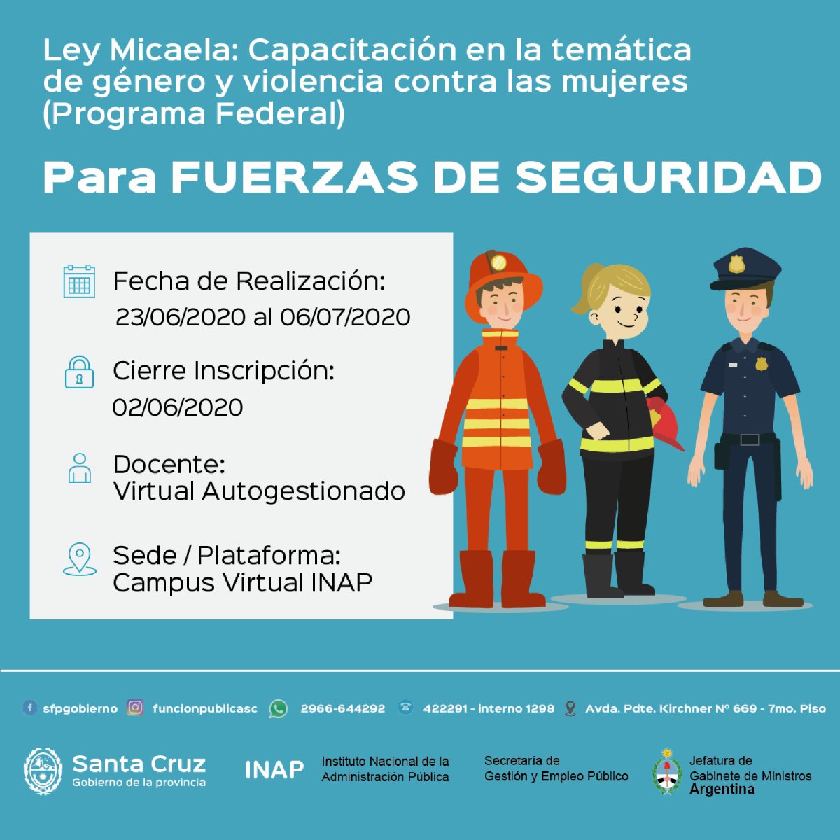 El Gobierno de Santa Cruz a través de la Subsecretaría de la Función Pública en conjunto con el Instituto Nacional de la Administración (INAP), informa que se encuentran abiertas las inscripciones para dos capacitaciones de la Ley Micaela, dirigidas a quienes desempeñan funciones en la Administración Pública y en las Fuerzas de Seguridad de la provincia.