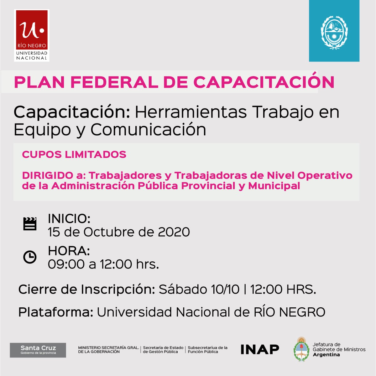 El Gobierno de Santa Cruz, a través de la Subsecretaría de la Función Pública, de la Secretaría de Gestión Pública dependiente del Ministerio de Secretaría General de la Gobernación, participa del Plan Federal de Capacitación para empleadas y empleados públicos en todo el país.