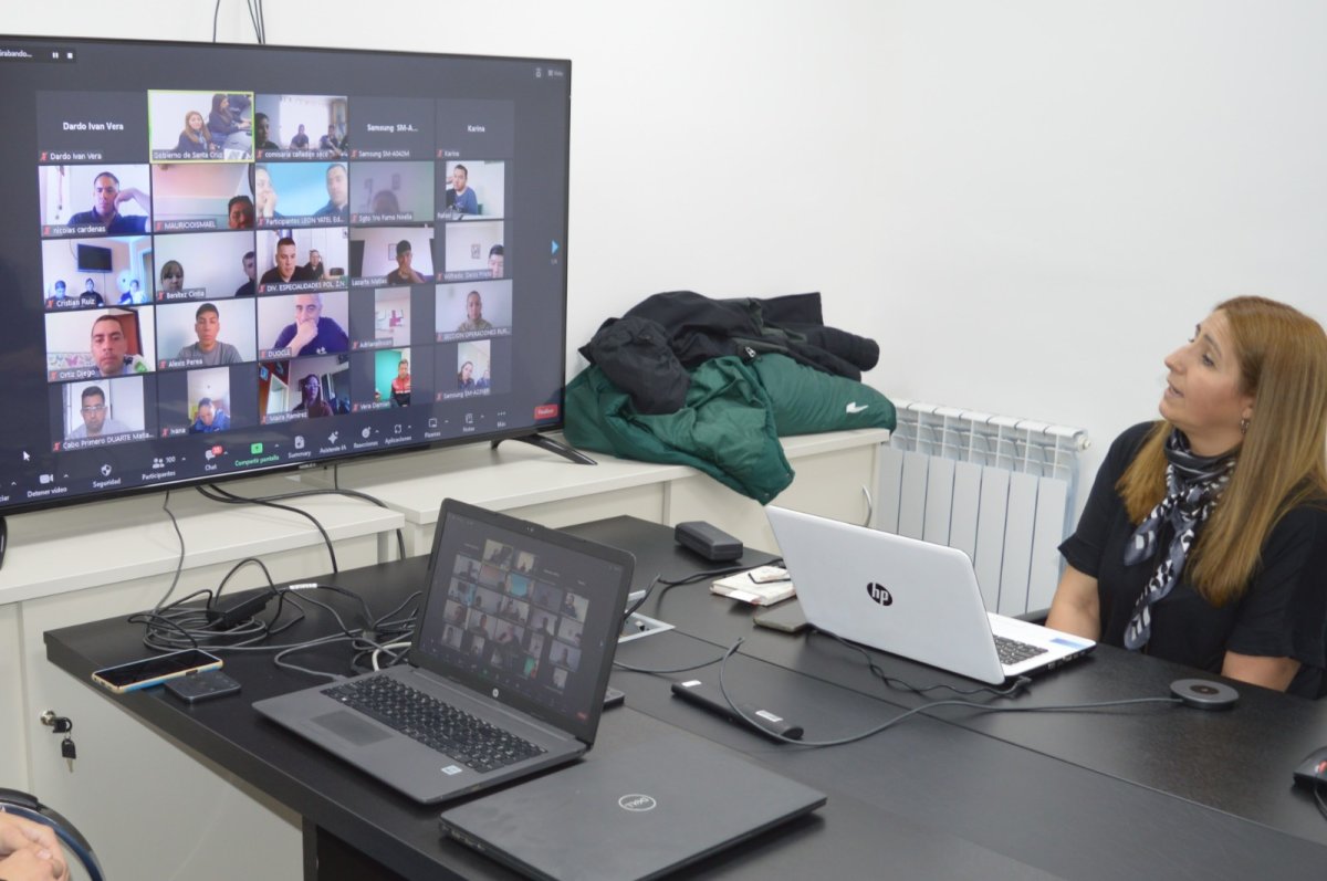 La subsecretaria de Fortalecimiento del Empleo Público y Recursos Humanos, Claudia Pardo, estuvo presente en una conferencia virtual con distintos referentes de la Policía de Santa Cruz, respecto a la implementación del Sistema SARHA para esta fuerza de seguridad provincial.