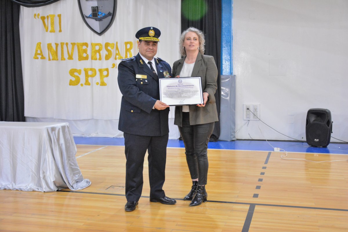 Cecilia Borselli, en representación del gobernador Claudio Vidal sostuvo: “Hoy celebramos 7 años de trabajo, compromiso y consolidación de una institución joven, pero finalmente comprometida con los valores del servicio público: la seguridad, la inclusión y el respeto por los derechos humanos”.