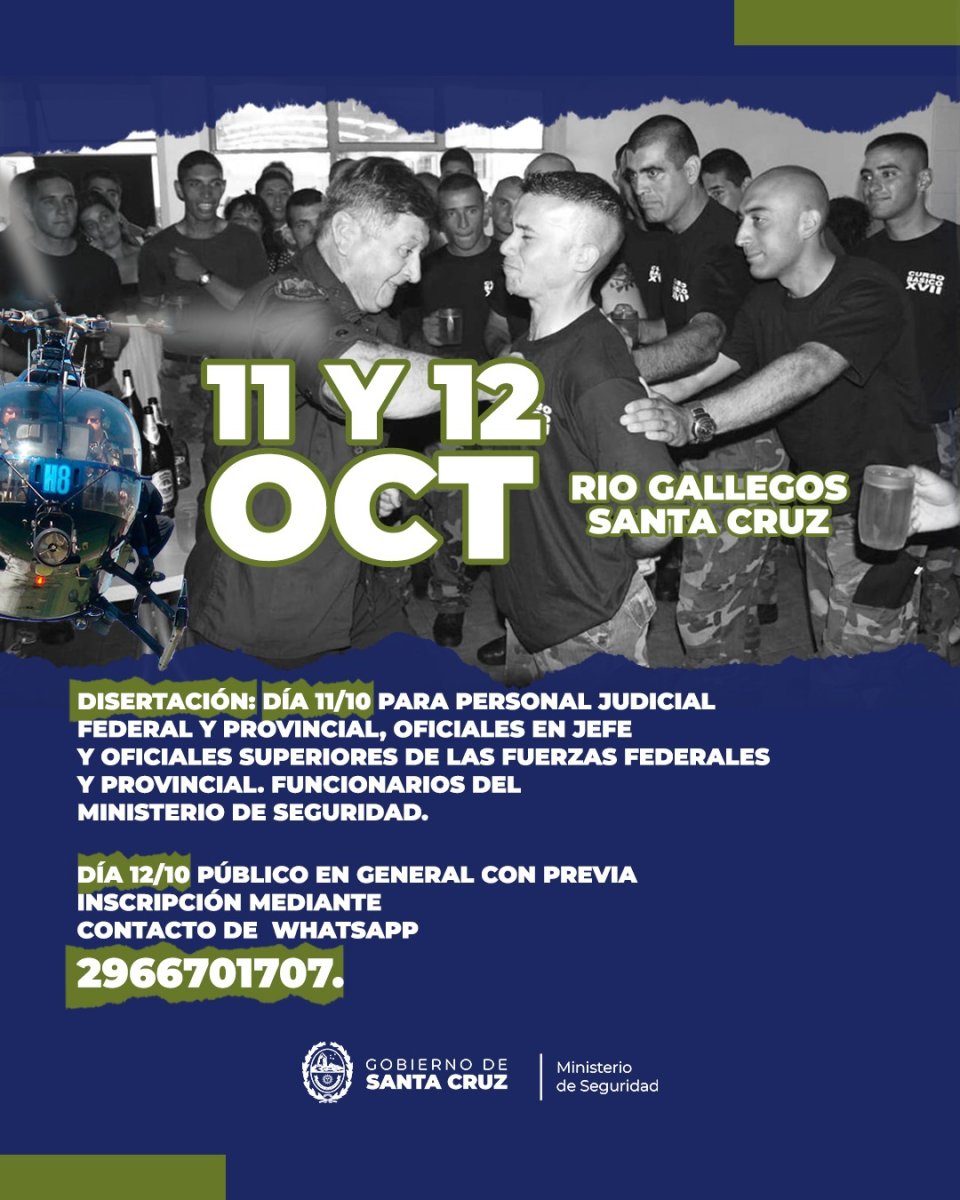 El Ministerio de Seguridad de la Provincia de Santa Cruz informa que los días 11 y 12 de octubre, Rio Gallegos será sede de una capacitación especializada en Gerenciamiento de Crisis, que estará a cargo del Crio. Gral. Claudio Pereyra, reconocido por ser el creador del Grupo Especial de Operaciones Federales.