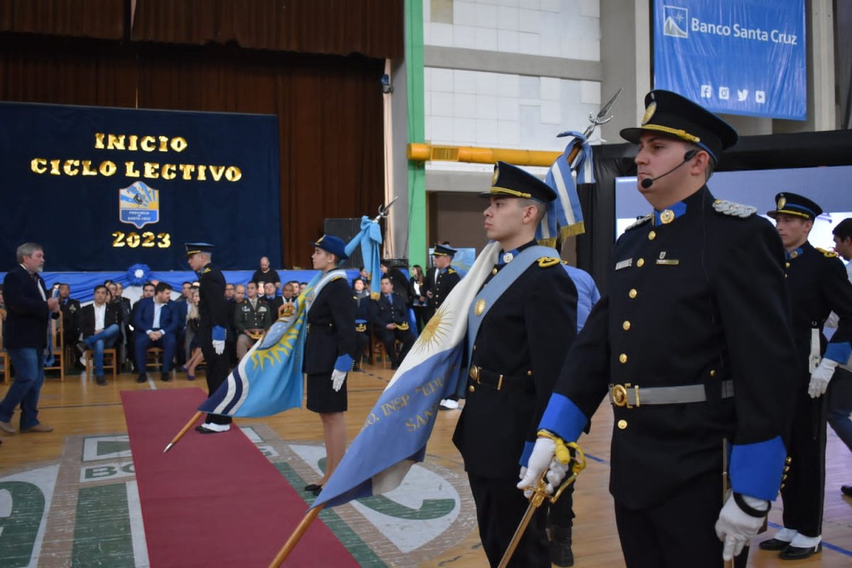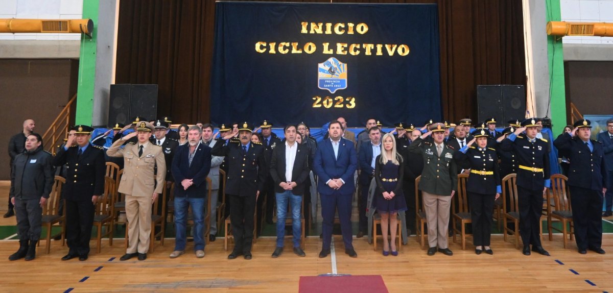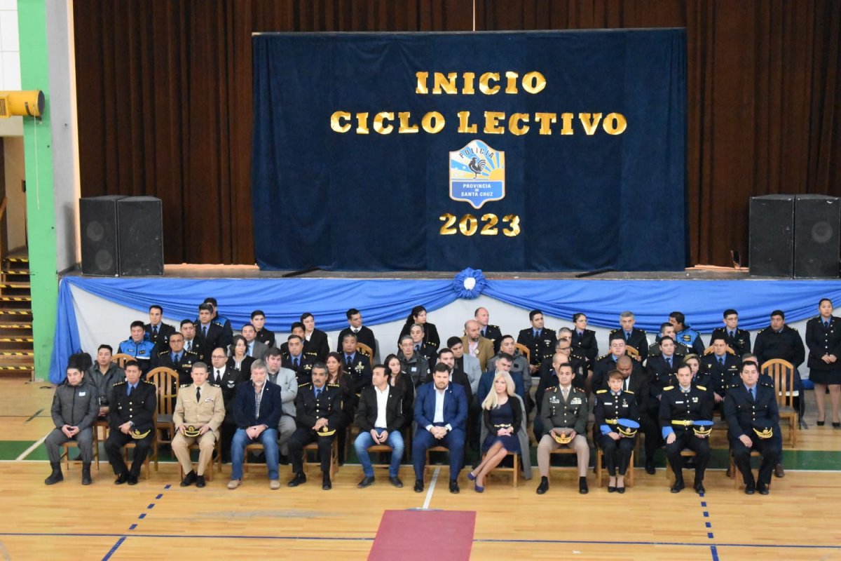 En las instalaciones del Atlético Boxing Club, el Ministro de Seguridad, Luca Pratti, encabezó, junto al Intendente, Pablo Grasso, el Jefe de Policía, Comisario General (R) José Luis Cortés y autoridades provinciales el acto del inicio de ciclo lectivo 2023 de la Escuela de Cadetes como así también de la Escuela de Suboficiales y Agentes de Río Gallegos y Caleta Olivia.