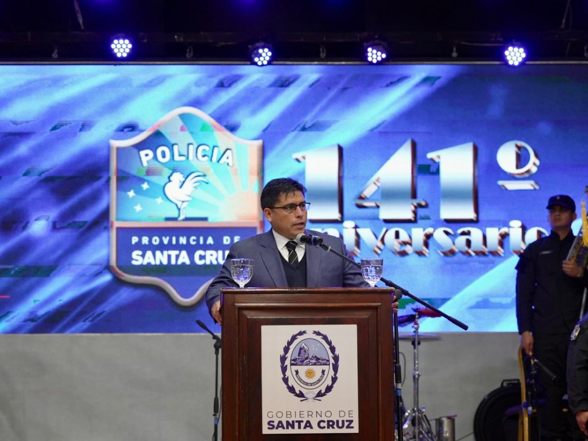 El gobernador Claudio Vidal presidió el acto por el 141° aniversario de la Policía de Santa Cruz, desarrollado en el auditorio Bet El de Río Gallegos. En su discurso respaldó a la cúpula policial, al ministro de Seguridad, Pedro Prodromos y realizó anuncios para la cartera.