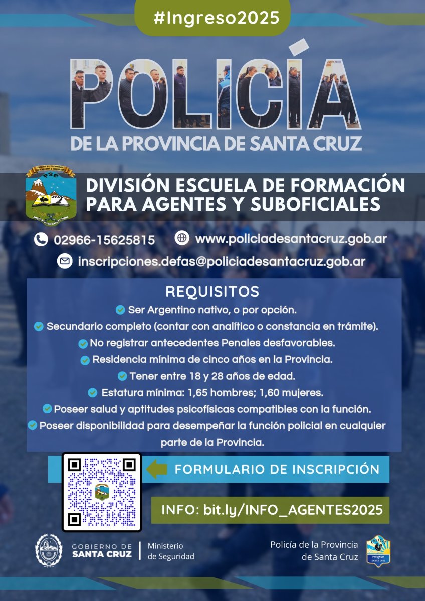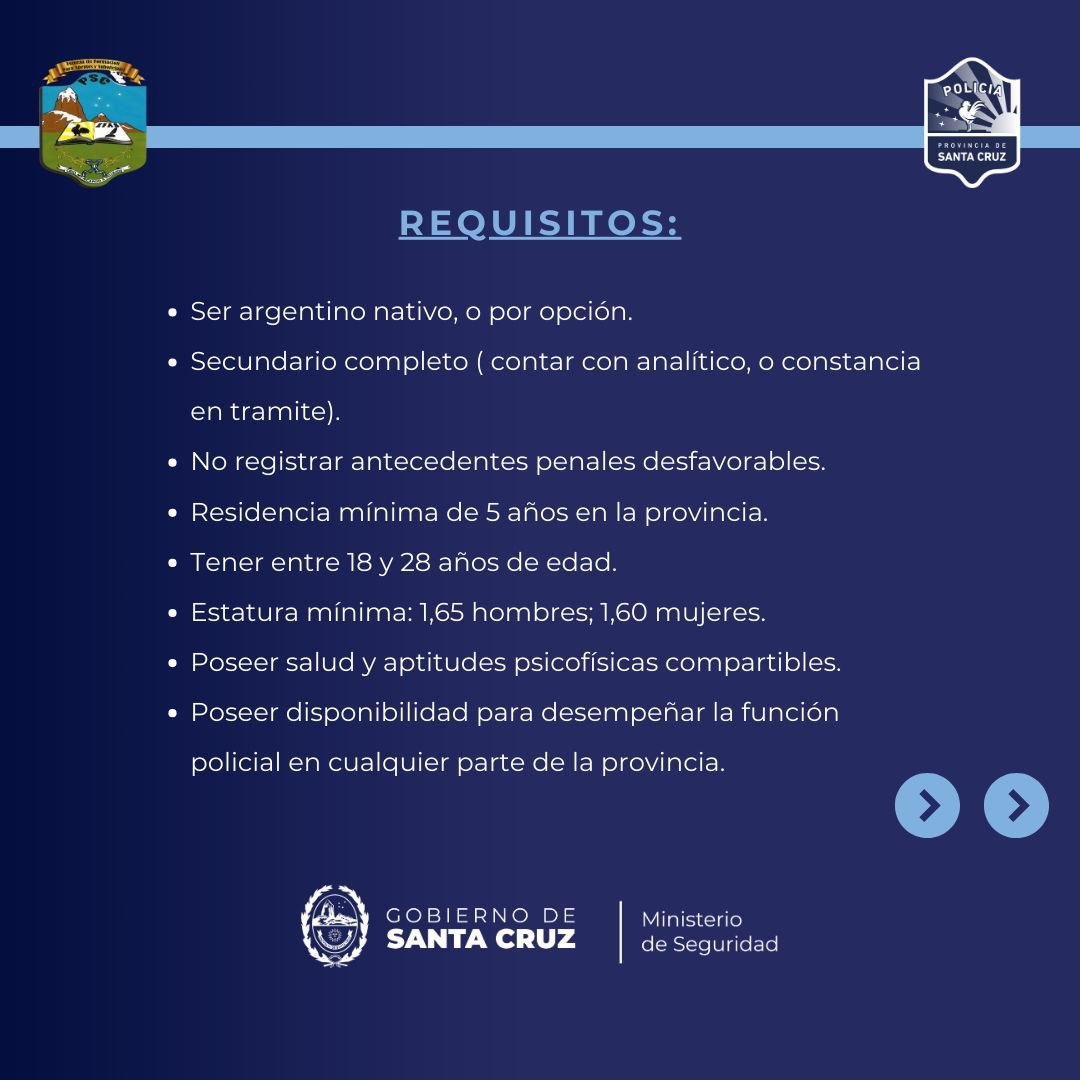 El Ministerio de Seguridad, a través de la Policía de Santa Cruz, convocó a varones y mujeres de entre 18 y 28 años a inscribirse para ser parte de la institución.