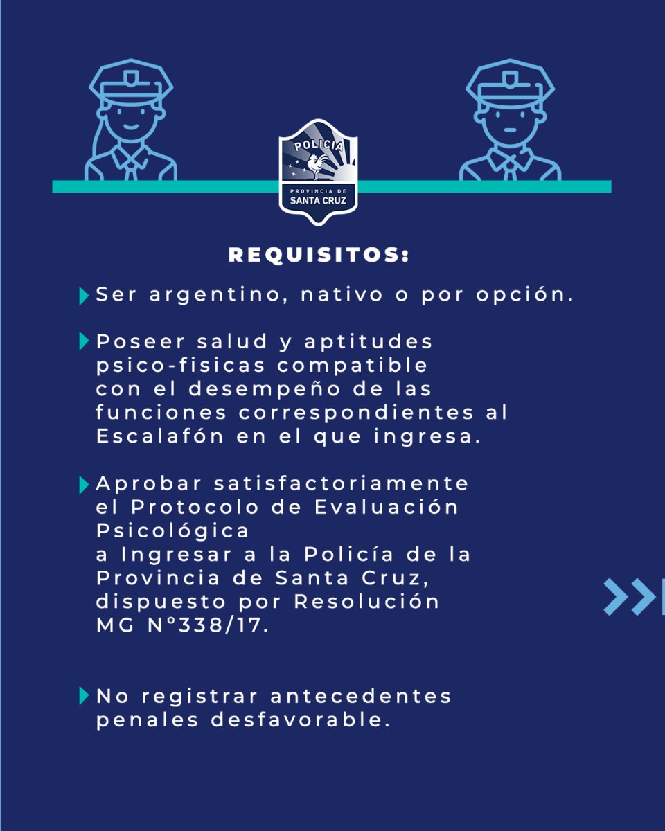 - Aprobar satisfactoriamente el Protocolo de Evaluación Psicológica para ingresar a la Policía de la Provincia de Santa Cruz, dispuesto por Resolución MG Nº338/17.