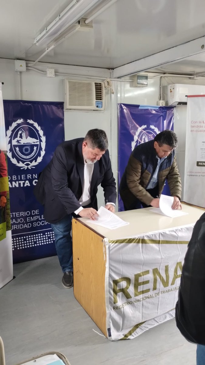 El Ministerio de Trabajo, Empleo y Seguridad Social de la Provincia de Santa Cruz firmó hoy un convenio de cooperación con el Registro Nacional de Trabajadores Rurales y Empleadores (RENATRE), con la finalidad de implementar acciones que protejan a los trabajadores rurales, como así también coordinar las políticas y los planes nacionales de fiscalización y en especial los relativos al control del empleo no registrado.